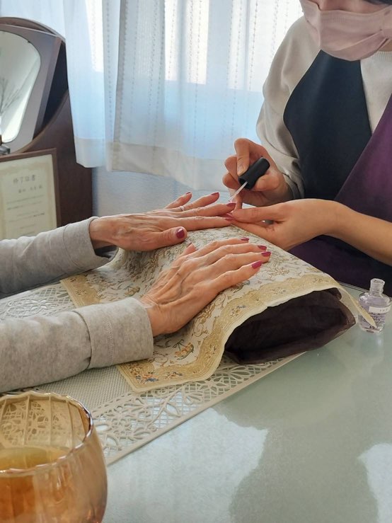 最初は少し緊張したご様子でしたが、優しく触れることで気持ちが和み、指先がキレイに整うと自然と笑顔に。モノではなく、心に残る時間を贈るという選択。そんな美容のかたちもあります。